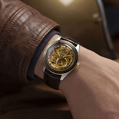 Powered by your motion as you wear the watch, the 21-jewel skeletonized automatic movement can store a maximum 40 hours of energy. If motionless for longer than 40 hours, wind the watch using the crown until you feel resistance.
