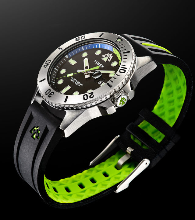 Our Anchorage brings a brand new 42mm stainless-steel case design to our rugged Expedition lineup. This watch boasts the authentic look of a true diver watch, with energizing blue and lime details; sizeable luminescent hour markers and hands; a scratch-resistant, anti-reflective sapphire crystal with date magnifier for enhanced viewing; and a unidirectional ratcheting bezel for tracking elapsed time. Opt for a sporty look with a quick-release co-molded silicone strap.Specifications