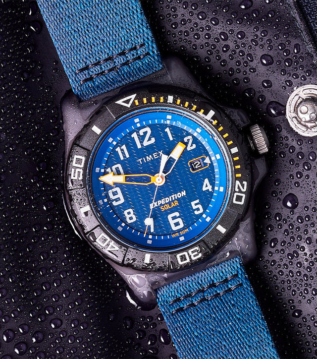 Rain or shine, inland or coast—Expedition goes the distance. Inspired by those who seek to preserve our planet, the new Expedition Free-Dive Ocean is equipped with several eco-friendly features: a solar-powered movement that lasts up to 4 months and eliminates the need for battery changes; a rugged blue case and comfortable strap made of #tide™ upcycled, ocean-bound plastic; and all-paper packaging. Of course, this collection doesn’t skimp on style either—the substantial 46mm case features a diver-inspired design with a unidirectional bezel and sturdy crown guard. The blue dial, featuring nautical patterns reminiscent of previous Timex diver-style watches, boasts a date window and large, easy-to-read hand and hour markers. Finally, its 50-meter water resistance rating allows you to make the most out of your time in the ocean without leaving this piece ashore.Specifications