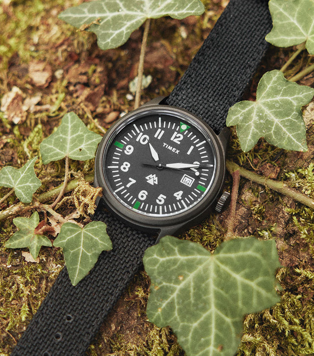 Easy to wear and planet-friendly, our Expedition Traprock is for those who love venturing outdoors but want to minimize their carbon footprint. It’s built with durable yet eco-friendly materials like a tapered fabric strap made from 100% post-consumer recycled plastic and lined with vegan apple leather, and a sturdy eco-ceramic case made from a special blend of ceramic and bio-based resin derived from castor plants. The clean-cut dial appears in earthy and energizing colorways that complement any ‘fit, and luminescent hands provide night visibility if you find yourself still exploring after dark. So, open your map (or your app), pick a trail, and get out there.Specifications