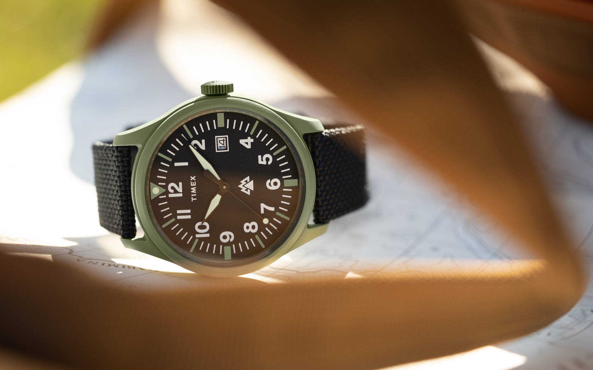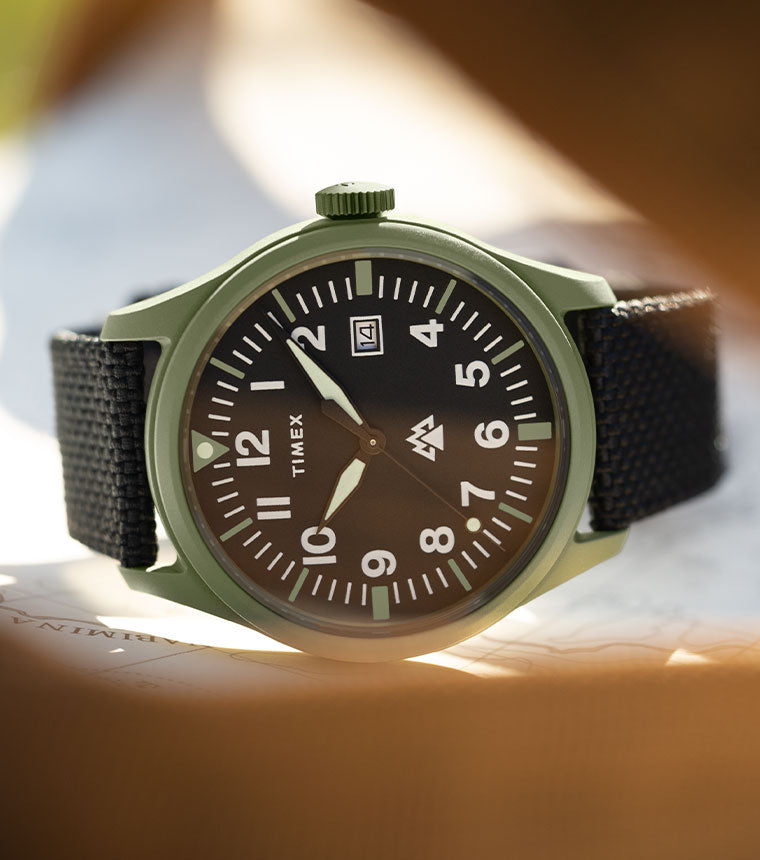 Easy to wear and planet-friendly, our Expedition Traprock is for those who love venturing outdoors but want to minimize their carbon footprint. It’s built with durable yet eco-friendly materials like a tapered fabric strap made from 100% post-consumer recycled plastic and lined with vegan apple leather, and a sturdy eco-ceramic case made from a special blend of ceramic and bio-based resin derived from castor plants. The clean-cut dial appears in earthy colorways that complement any ‘fit, and luminescent hands provide night visibility if you find yourself still exploring after dark. So, open your map (or your app), pick a trail, and get out there.Specifications