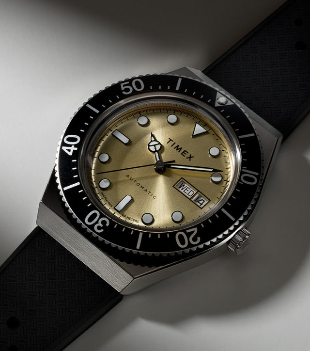 Our M79 Automatic is something entirely new, even though it might look familiar. Inspired by the 1970s Q Timex® and elevated with a 21-jewel automatic movement, this watch is a fresh interpretation of a much-loved Timex icon. The 40-hour power reserve of its Japan-made, self-winding, automatic movement is energized by your motion and can also be wound manually by using the crown. We’ve updated it with a perforated and textured black synthetic rubber strap that offers an athletic style and soft-to-the-touch comfort. This watch also features a black unidirectional bezel, a deep champagne dial, luminous dial markings, sturdy 40mm stainless-steel case, day of the week and date window, and an exhibition case back, making it a modern timepiece that captures the bold spirit of an era that changed everything.Specifications