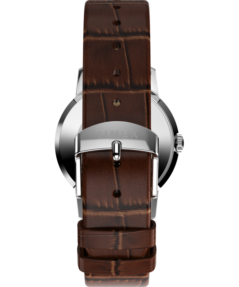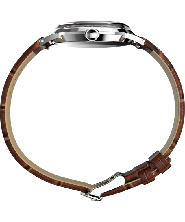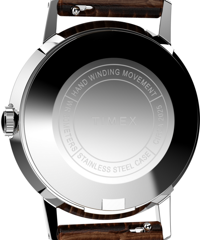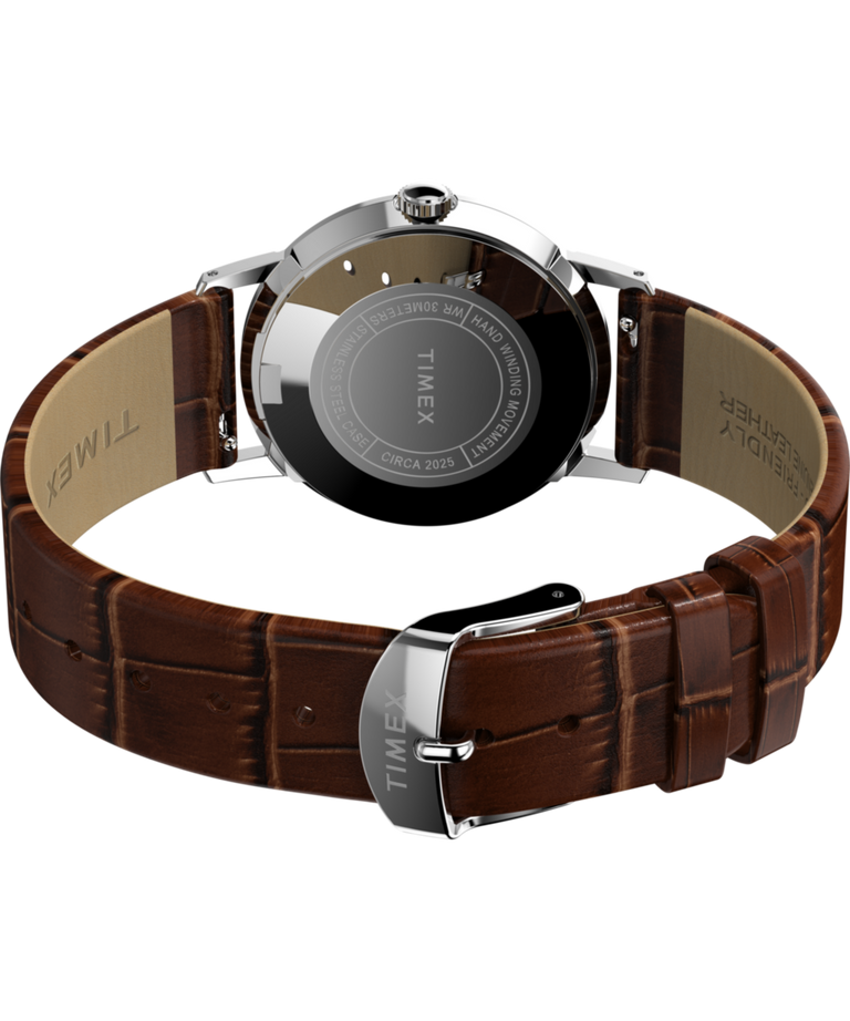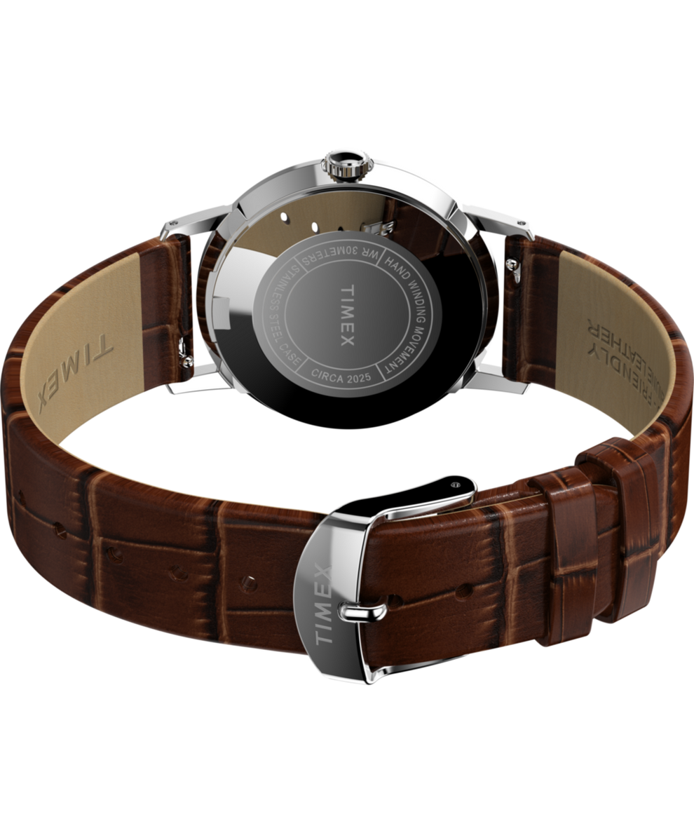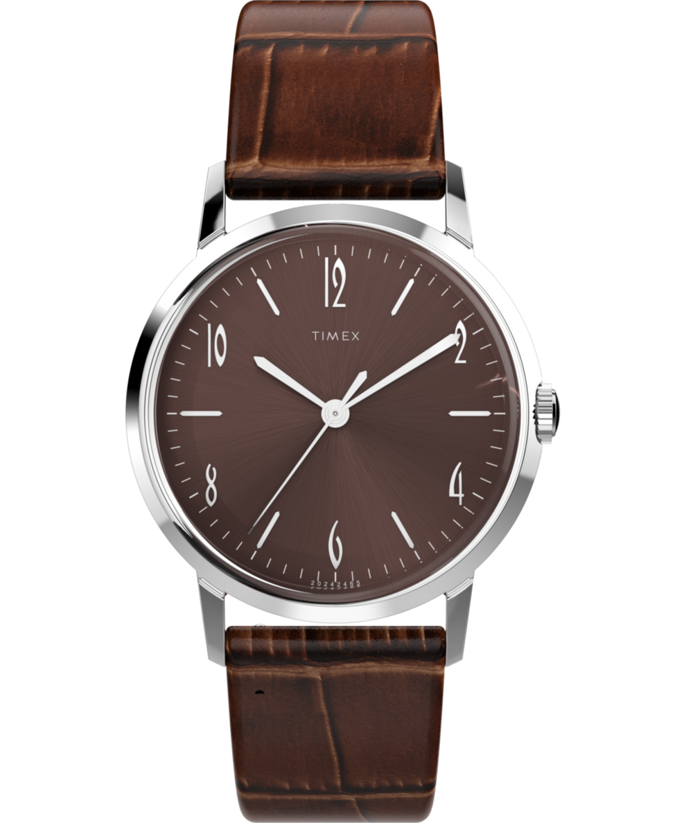 This Marlin offers a 34mm stainless-steel case that is both simple and elegant, providing the perfect frame for a rich chocolate brown dial. The mechanical movement and domed acrylic crystal stay true to classic watch styles of the past, while the eco-friendly natural leather strap sourced from the Leather Working Group (LWG) perfectly complements the dial with its rich chocolate brown color, glossy finish, and enticing crocodile grain.Specifications