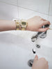 Reintroducing the T80 Ring Watch in a sleek classic gold finish, MM6 Maison Margiela and Timex revisit the design through the Maison’s irreverent perspective, transforming a familiar icon into an object of quiet subversion. A polished stainless-steel case in gold, set beneath a mineral lens and paired with a brushed expansion band designed to be worn on the finger, redefines the gesture of timekeeping itself. Its mirrored mask displays digits from 0 to 23, with ‘6’ encircled in tribute to MM6’s emblematic numeral, a subtle play on perception and identity. At once precise and playful, the T80 Ring Watch stands as a modern artifact of individuality, offering a new way to wear time. Offered in two sizes - S/M: 16.5mm dia., 51.9mm circumference, US size 6. M/L: 19.8mm dia., 62.1mm circumference, US size 10.Specifications