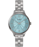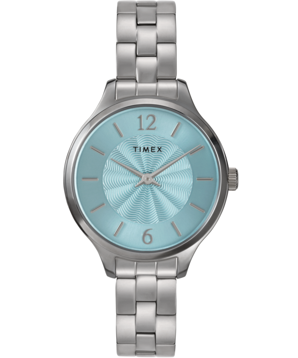 This fresh update to our Peyton offers an elegant 32mm case and an aquamarine dial featuring a unique pattern that radiates from its center, creating a stunning interplay of texture and light. Faceted hour markers and a sleek handset lend sophistication and femininity to this timepiece, complemented by an understated silver-tone polished stainless-steel bracelet that’s both versatile and stylish.Specifications