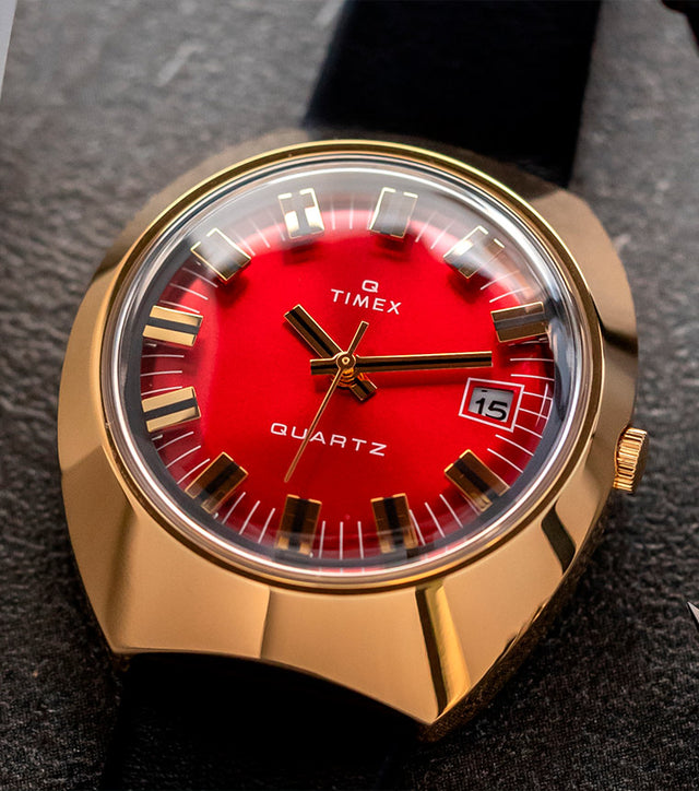 We’re deeply proud to bring you this 1972 blast from the past expanding our Q Timex Reissue story. This archival quartz watch delivers boldness from every angle, boasting a gold-tone tonneau case profile, 43mm long and 39mm wide, with all-around polished finishing. You’ll also find our usual attention to detail with dimensional floating hour markers that hover above the striking-red dial and a polished handset to match, plus a period-perfect domed acrylic crystal on top. As for your story and the new watch you’re sporting, we say sit back and let the record play on for a little while. We’ll catch you on the flip side.Specifications