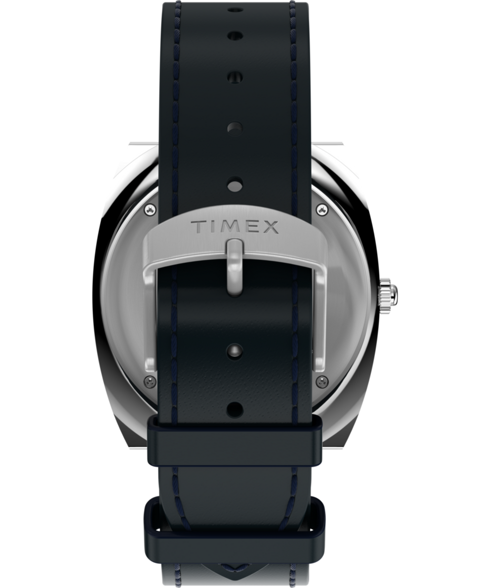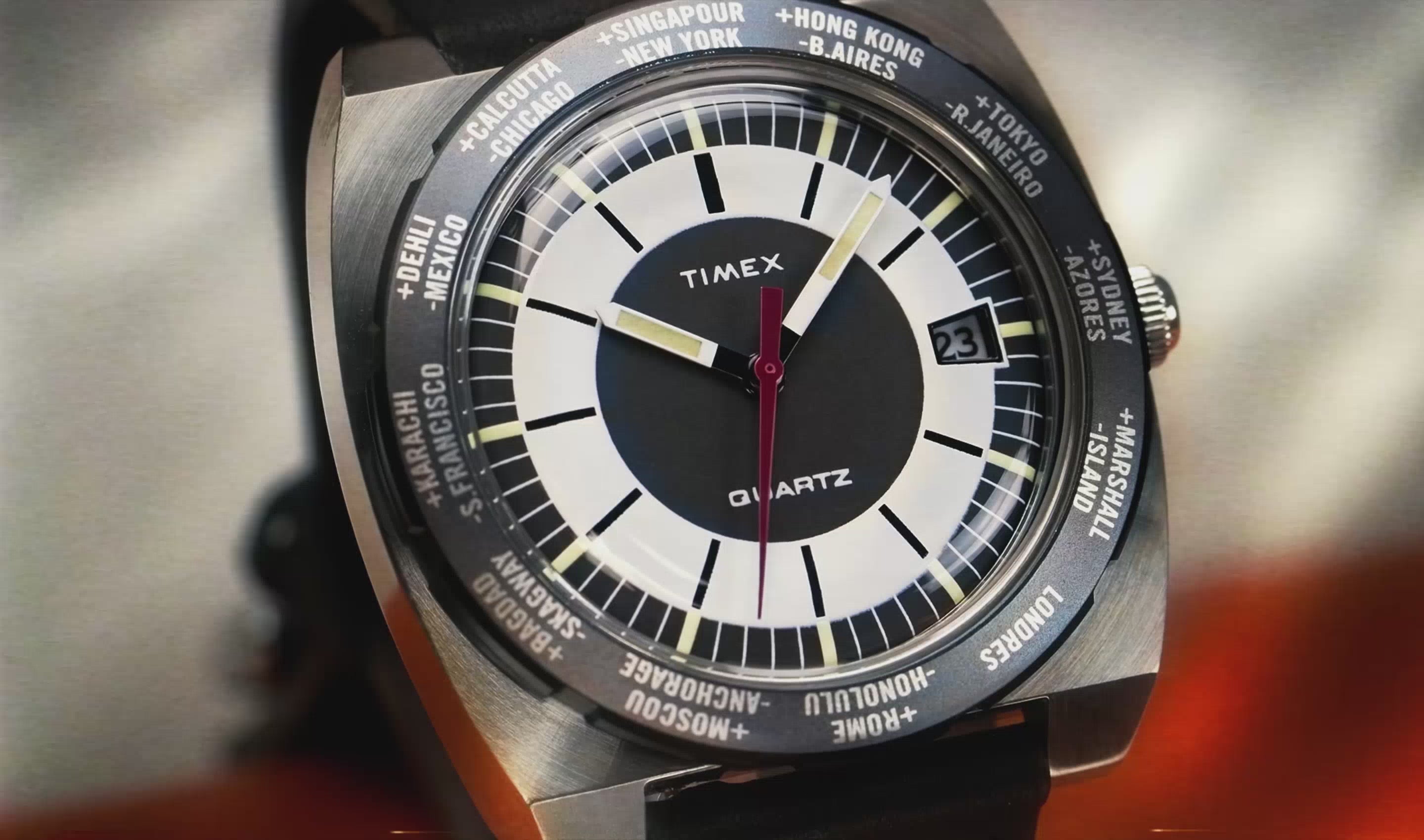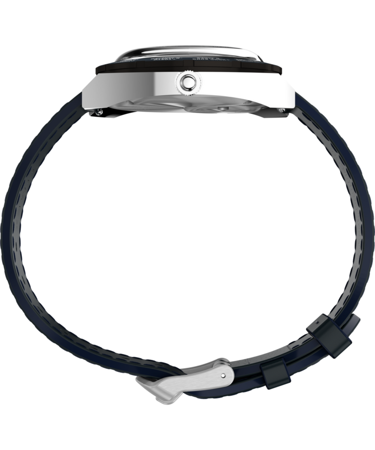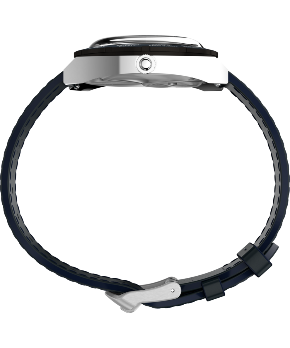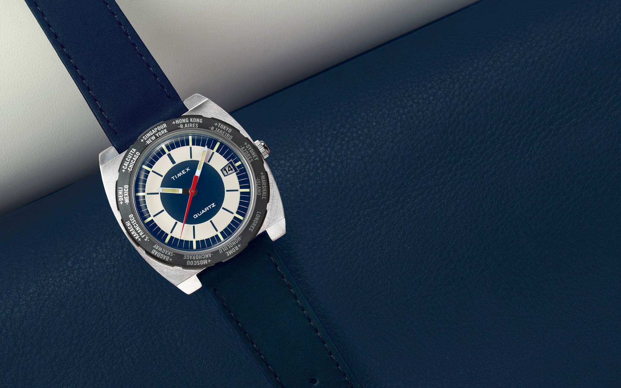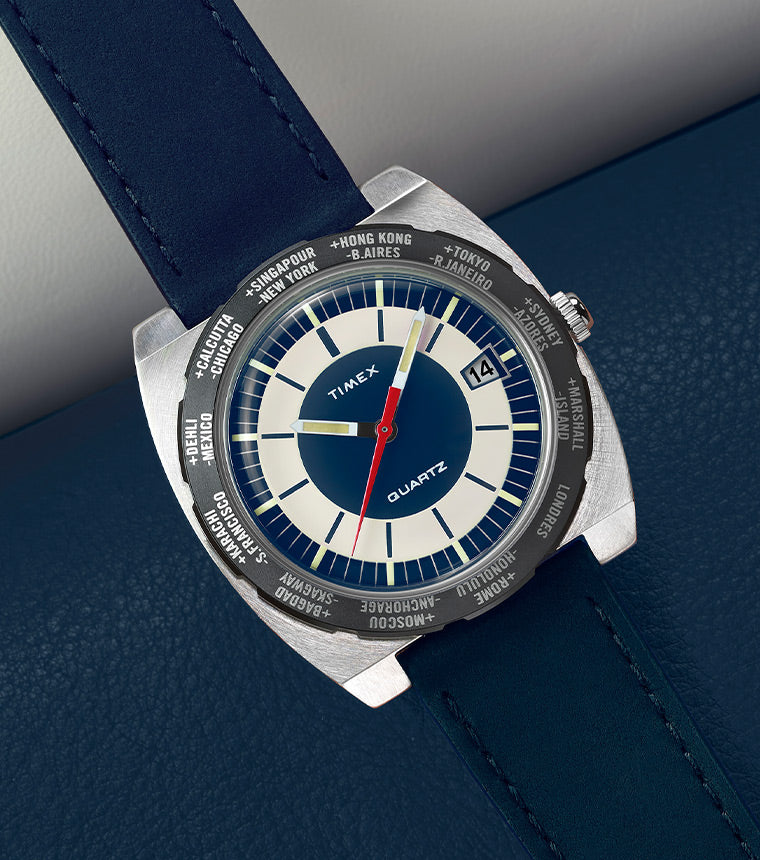 The Q Timex® 1972 World Time is a reissue-inspired timepiece that brings a unique 1970s design from the Timex archive back to life for 2025. Originally created for stylish travelers in the golden era of jet-setting, its rotating bezel marks Greenwich Mean Time and follows with names of 23 cities around the globe, making it easy to read the time in any time zone. This style, created for the European market, features the French spelling for the noted locations. Other details like a brushed and polished 39mm barrel-shaped stainless-steel case, a minimalistic dial, a geometric red second hand, and a domed crystal – all the height of cool back in 1972 – make this a faithful tribute to the original and a stylish accessory for any modern traveler. This season, we’ve paired this frequent flyer with a blue supple natural leather strap sourced from SB Foot Tanning Company.Specifications