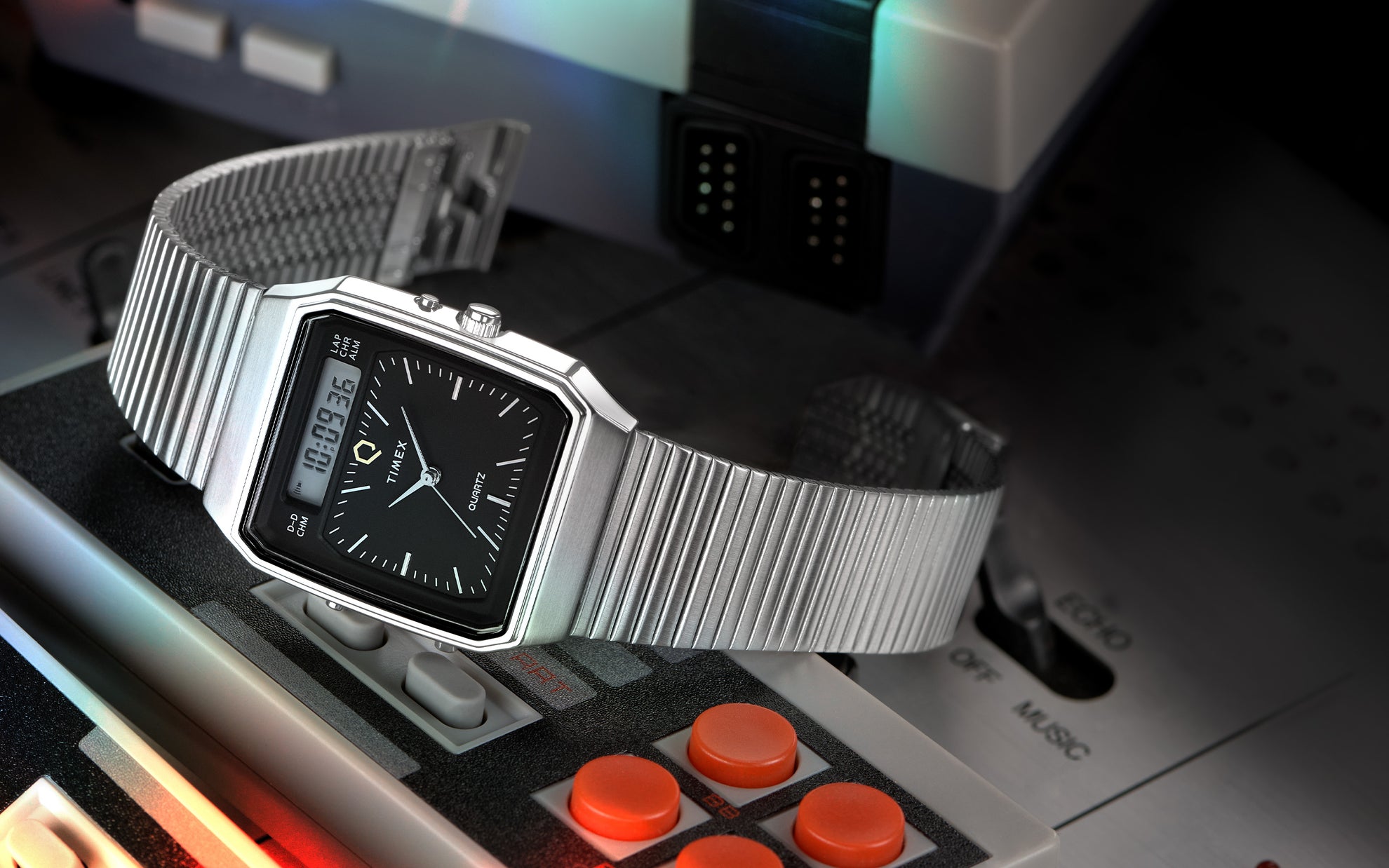 A Q Timex® 1982 Ana-Digi Reissue watch with a black dial and silver-tone case is placed on a retro gaming console. The watch has an analog and digital hybrid display, a stainless steel bracelet, and a distinctive vintage aesthetic. The background features an old-school controller with red buttons and a nostalgic gaming atmosphere.