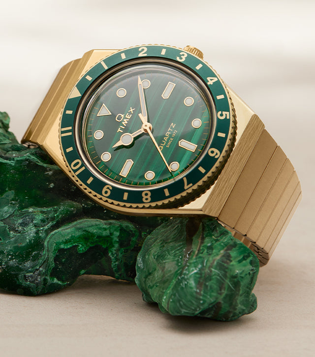 Our Women’s Q Timex brings the healing energy of the earth to your everyday look with a brilliant green malachite stone dial. Believed to cleanse the body of negativity and inspire positive transformation, natural malachite features unique striations that make each dial as one-of-a-kind as you. The brushed and polished 36mm gold-tone stainless-steel case is accented with a green bezel that beautifully complements the rich, earthy tones of the dial, and we’ve paired this beauty with our Perfect Fit stainless-steel expansion band for a hassle-free, custom fit. Echoing the heritage of our original Q Timex 1979 Reissue, this timepiece also boasts iconic features like a rotating bezel, functional battery hatch, and domed acrylic crystal.
