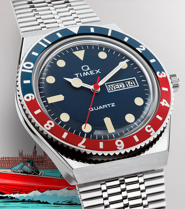 First released in 1979, our original diver-inspired Q Timex gave a new generation a modern Timex® watch with quartz technology. A true reissue, we recreated every detail—including the true-to-the-era woven stainless-steel bracelet, a rotating top ring, and luminescent paint—and ticking inside is a modern quartz movement.Specifications