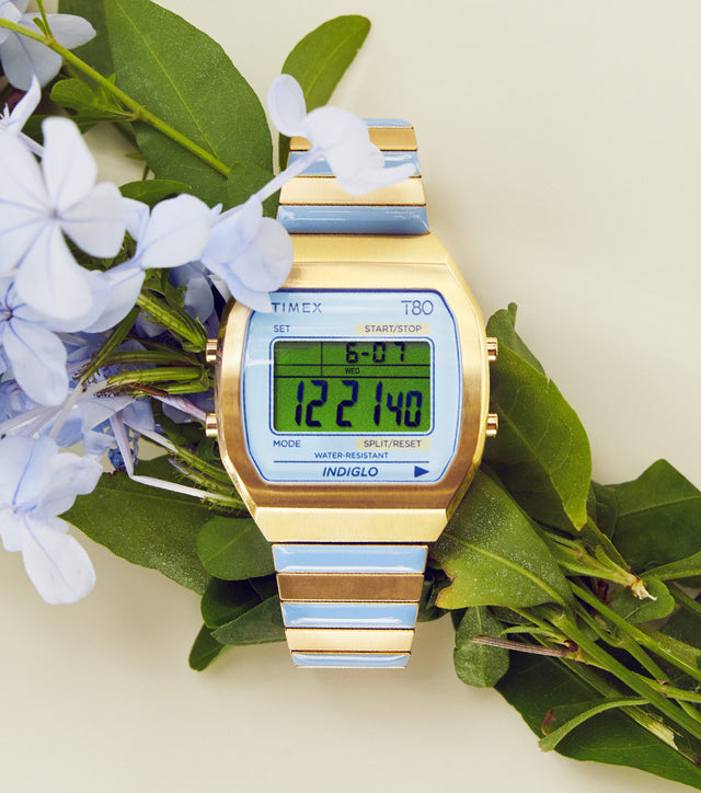 Dive into a world of color and luxe. Our Timex T80 transports you to sun-soaked days in faraway destinations with a lens and stainless-steel Perfect Fit™ expansion band in a captivating colorway that brightens up all your vacation looks. Other details include all you’d expect from our T80 – a chronograph function, daily alarm, INDIGLO® backlight, and date display.Specifications
