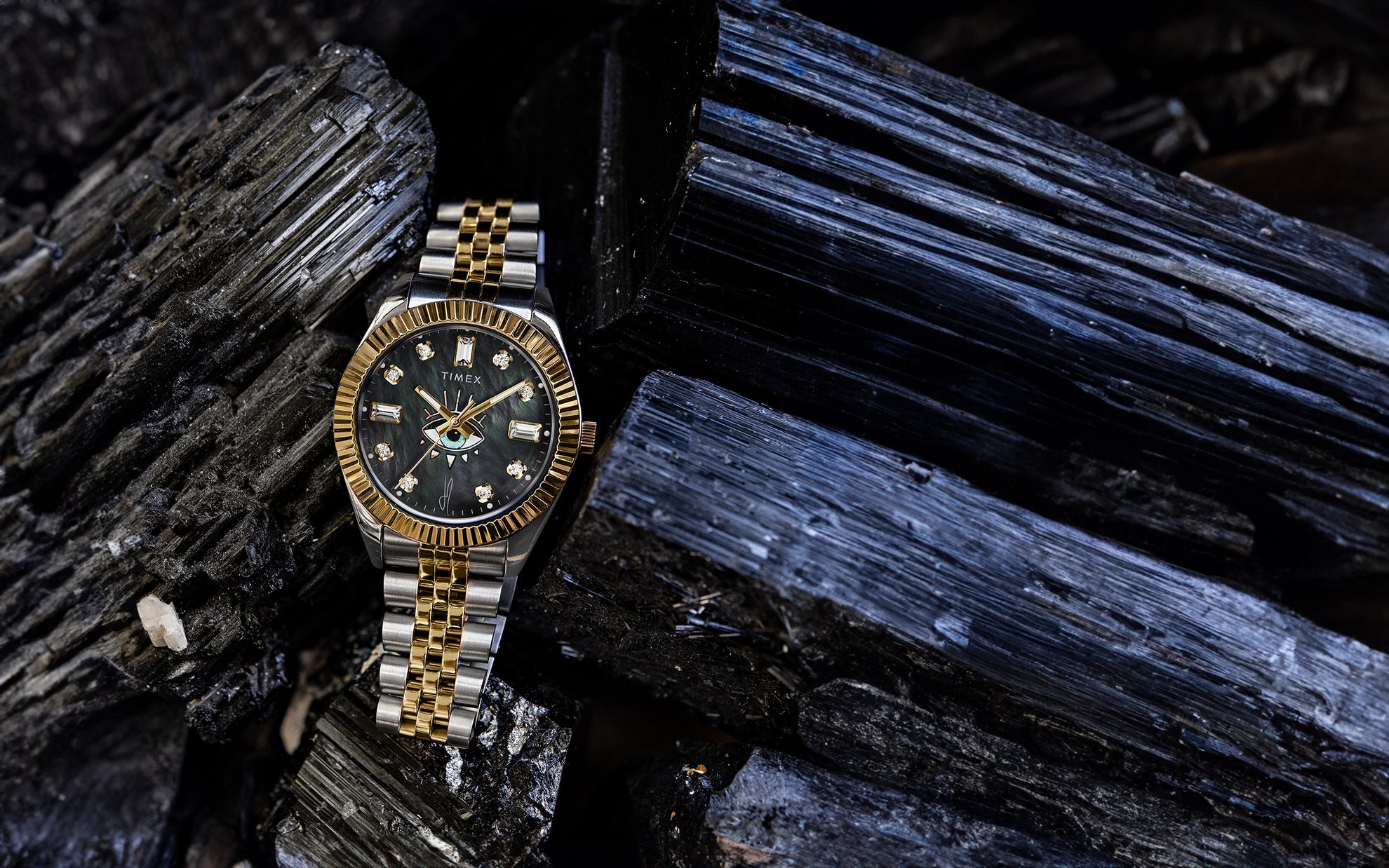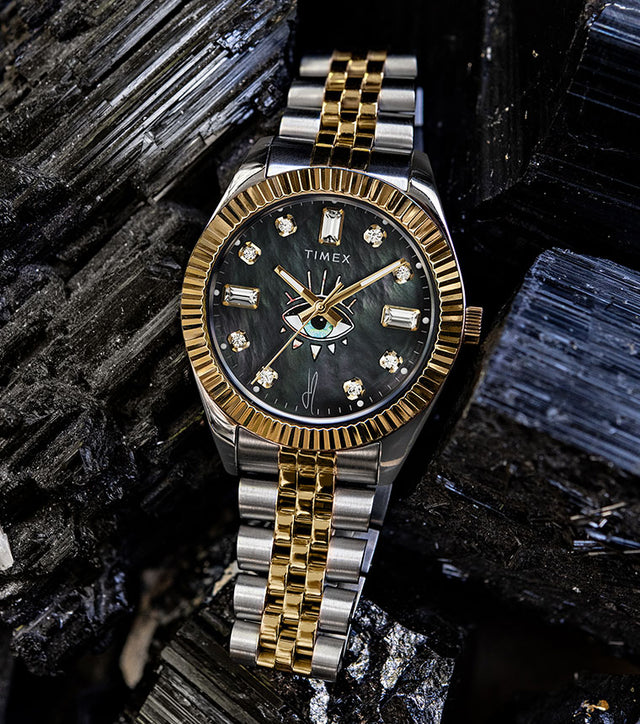 Bring an aura of allure to your layers. Our Timex x Jacquie Aiche Allure has a black mother-of-pearl dial paired with a two-tone stainless-steel case and bracelet. This limited-edition timepiece emanates effortless elegance, limitless radiance, and of course, the captivating mystique of Jacquie's signature tribe eye. Time is of the essence...“Our new Timex x Jacquie Aiche Allure Collection elevates every moment. When designing this capsule, I was inspired to create a trio of timepieces that would feel refined and luxurious, while still honoring the rebellious edge that has been in the DNA of our brand since the beginning. I love all three so much - each has its own alluring energy…A powerful presence that is entirely its own.” - Jacquie Aiche