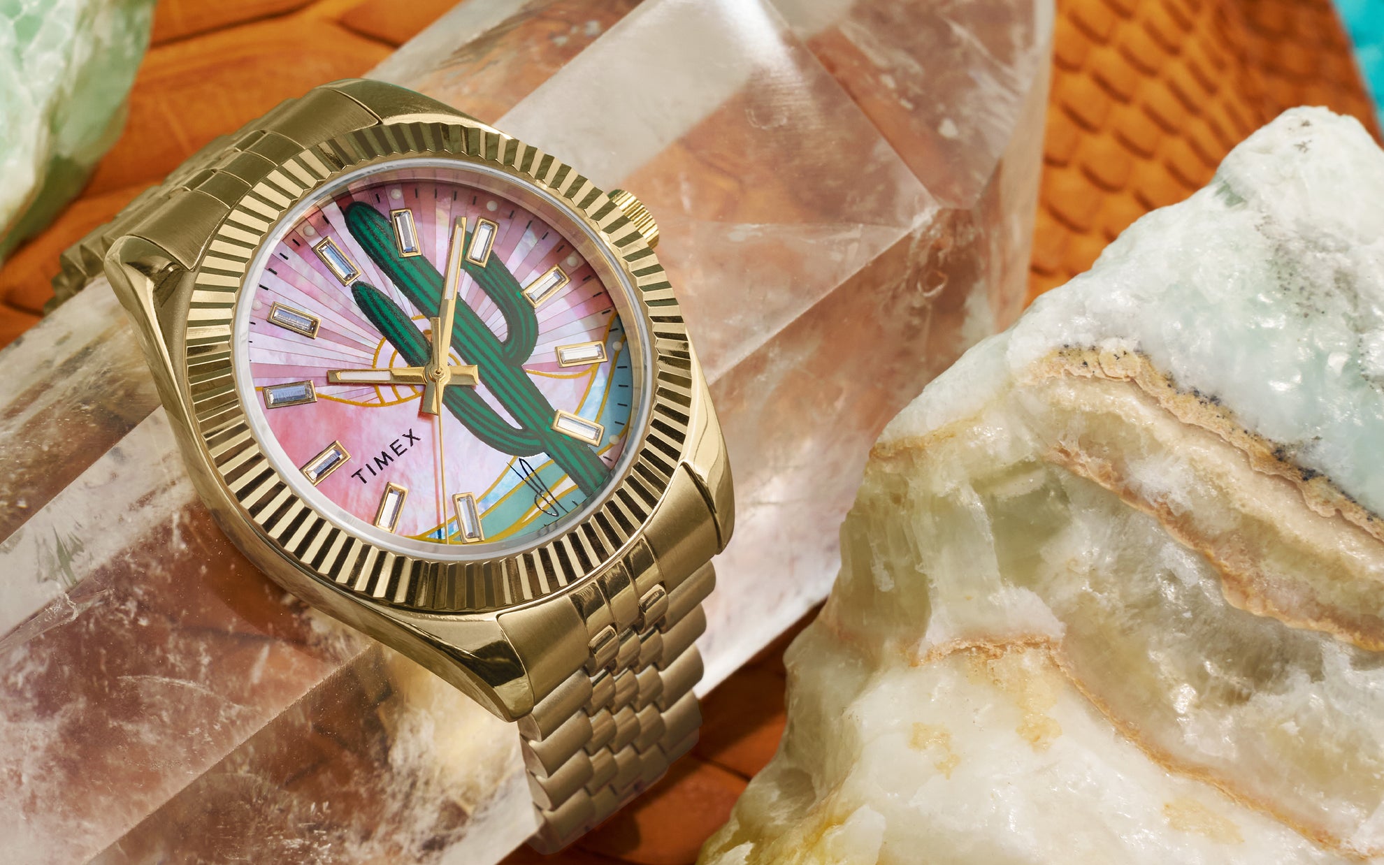 Inspired by the natural beauty and serenity found in the desert, the Timex x Jacquie Aiche Desert Daze timepiece serves as a reminder that time for yourself, and your spirit, is always worth taking. The dial showcases a desert mosaic with a pink sky that’s pieced together using shimmering mother-of-pearl that glistens with your every movement. Faceted Austrian crystals mark the hours, while the 36mm gold-tone case and matching gold-tone stainless-steel bracelet illuminate your wrist stack with a warm glow.Specifications