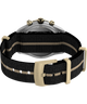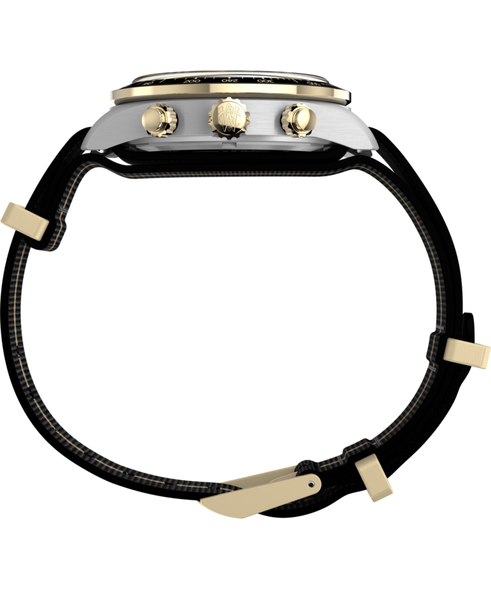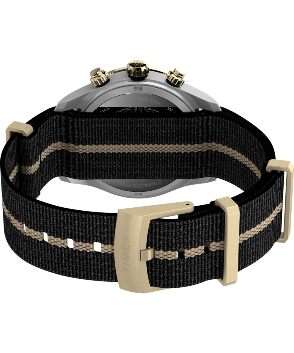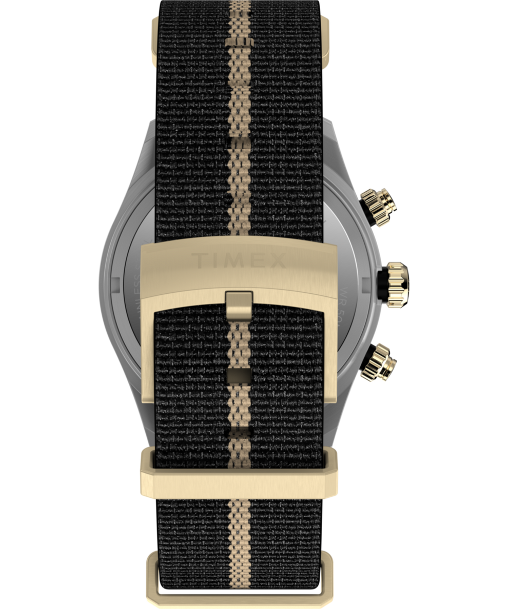 The Waterbury Heritage Chronograph combines modern functionality with timeless design, featuring a chronograph to track elapsed time and a black tachymeter bezel for determining average speed. Complementing its 39mm brushed stianless-steel case is a striped recycled fabric strap that channels the effortless tailoring of classic American menswear. Double-layered for durability and designed with convenient slip-thru construction for easy on and off, it delivers a laid-back confidence on the wrist. The black or silver-tone dial is accented by contrasting sub-dials and safeguarded by an anti-reflective mineral glass crystal for enhanced clarity. Luminant hands ensure visibility in lowlight conditions, while applied indices and intricate detailing on the crown and pushers add a refined touch.Specifications