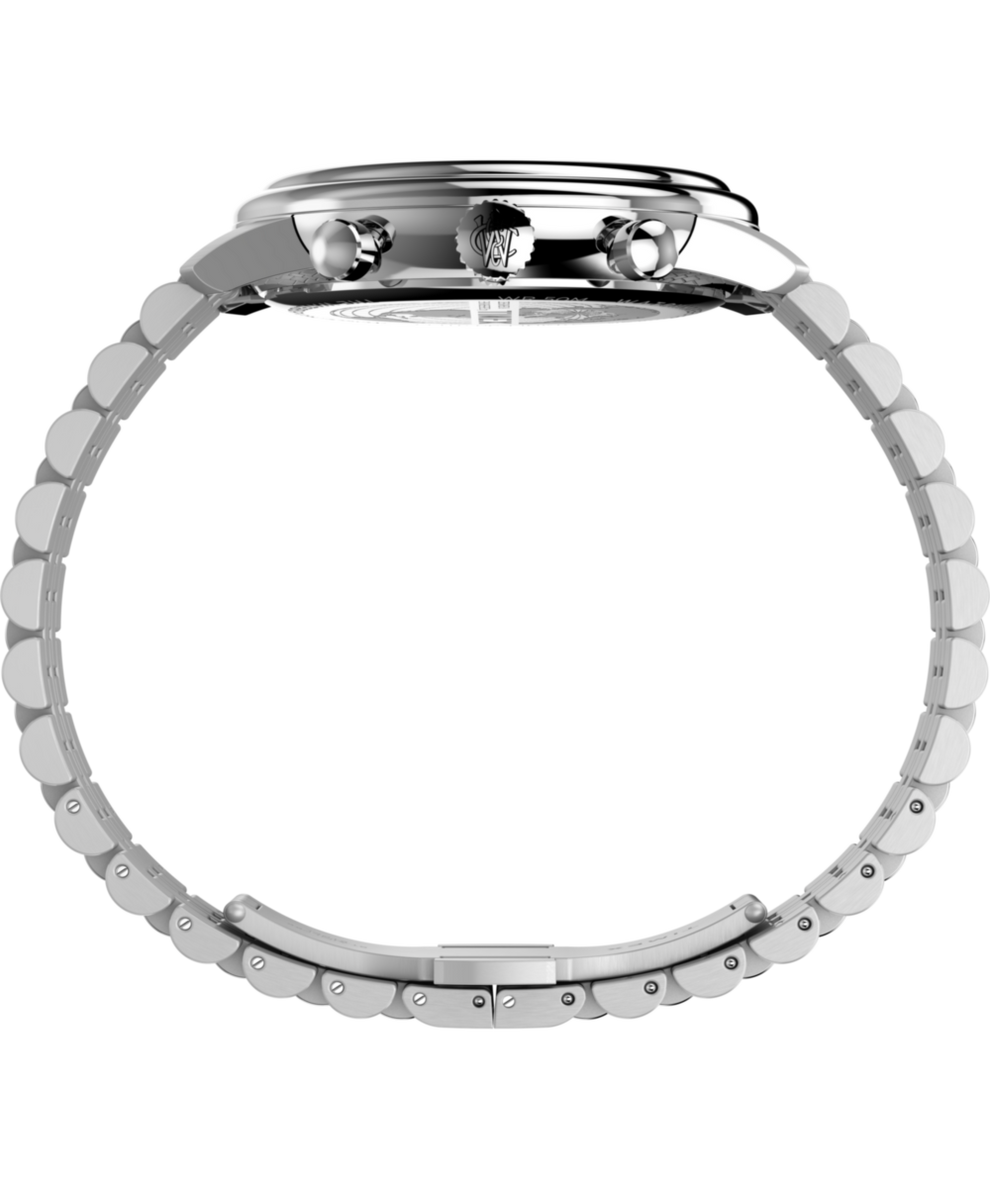Defined by sharp lines and sweeping curves, the Waterbury Metropolitan features an enhanced 41mm stainless-steel case with an elegant two-tiered bezel. Encircling the black dial are beveled markers and a rail track, paired with a sleek handset. This sophisticated timepiece is equipped with a two sub-dial chronograph movement for tracking elapsed time and is offered with a stainless-steel bracelet with a butterfly clasp.Specifications